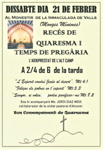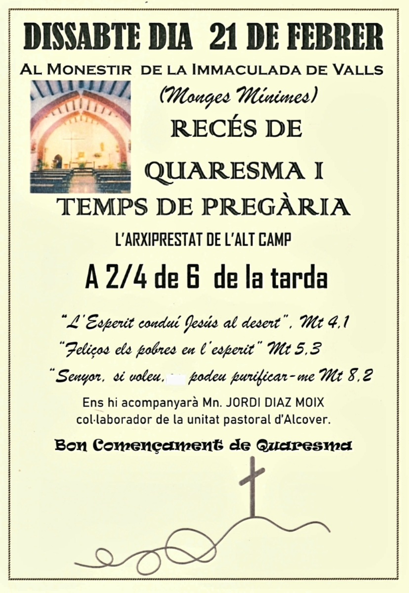 Que la Quaresma sigui un temps especial per fer una ullada als nostres deserts personals i comunitaris per tal de viure-hi segons Jesús i l’Evangeli.