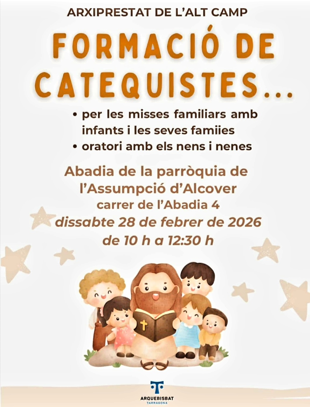 A cada catequista, li dic “Vine! A la TROBADA de formació”. No oblidem que ser catequista és ser deixeble missioner, enviat o enviada per a fer present l’anunci de Jesús amb la paraula i el testimoni de la pròpia vida. Catequista! Et cal l’acompanyament, la formació, el desvetllament vocacional, el creixement en l’amor. Diu el papa Francesc que «en la boca del catequista torna a ressonar sempre el primer anunci: «Jesucrist t’estima, va donar la seva vida per salvar-te, i ara viu al teu costat cada dia, per il·luminar-te, per enfortir-te, per alliberar-te». Catequista! Valora que molts infants (moltes famílies!) escolten a la la Catequesi el “primer anunci” que se l’anomena «primer» per ser al començament, el primer en un sentit qualitatiu, perquè és aquell que sempre cal tornar a escoltar de diverses maneres i aquell que sempre cal tornar a anunciar de totes maneres al llarg de la catequesi, en totes les seves etapes i moments» (Evangelii gaudium, 164).